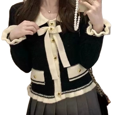 Huchao Fungus Edge Color a juego de manga larga con lazo, suéter de punto, cárdigan de mujer, suéter informal de invierno dulce para mujer